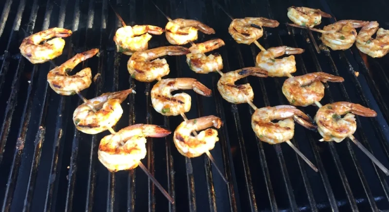4. Lightly oil the grill grate and place shrimp skewers on the preheated grill. Cook 3 minutes, then turn and cook an additional 2-3 minutes or until shrimp slightly firm.