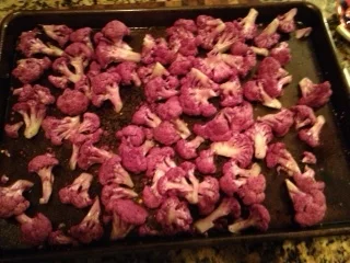 pURPLE CAULIFLOWER GOING INTO THE OVEN TO ROAST...