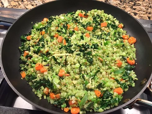 In a frying pan heat oil over medium heat. Add red pepper flakes, carrots, kale and riced broccoli. Sauté until soft, about 5 minutes.
