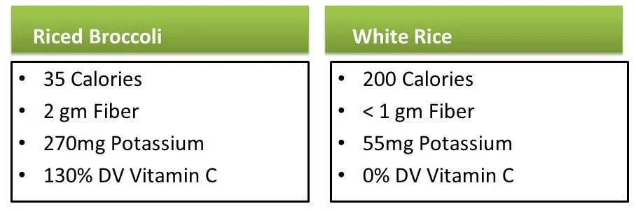 /Riced Broccoli is a great alternative to white rice because it’s much lower in carbohydrate and calories, and is rich in fiber, potassium and vitamin C.